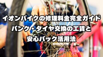 イオンバイクの修理料金完全ガイド|パンク・タイヤ交換の工賃と安心パック活用法 「自転車がパンクしてしまった…」「タイヤ交換っていくらかかるの?」そんな悩みを抱えていませんか? この記事では、イオンバイクの自転車修理料金について、パンク修理、タイヤ交換、チェーン交換、ブレーキ調整など、すべての主要な修理メニューの工賃と総額を詳しく解説します。 さらに、修理工賃が3年間50%オフになる「安心パック」の…
