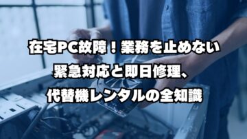 在宅PC故障!業務を止めない緊急対応と即日修理、代替機レンタルの全知識 「在宅ワーク中にパソコンが起動しなくなった!」 「画面が真っ暗...これでは仕事にならない」 「修理に出したら何日もかかる?その間の業務はどうすれば...」 在宅ワーカーにとって、パソコンは「収入を生み出す生命線」です。そのPCが故障することは、業務全体の停止を意味しかねない重大な緊急事態です。 トラブル発生時に重要なのは、「…