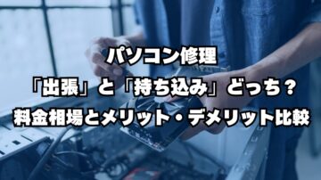 パソコン修理「出張」と「持ち込み」どっち?料金相場とメリット・デメリット比較 「パソコンが壊れたけど、修理はどうやって頼めばいい?」 「重いデスクトップPCを店まで運ぶのは大変...」 「出張修理は便利そうだけど、料金が高くならないか不安」 パソコン修理を依頼する際、「出張サービス」と「店舗持ち込み」のどちらを選ぶべきか、悩みますよね。最適な選択は、故障の症状、手軽さ、費用のどれを優先するかによっ…